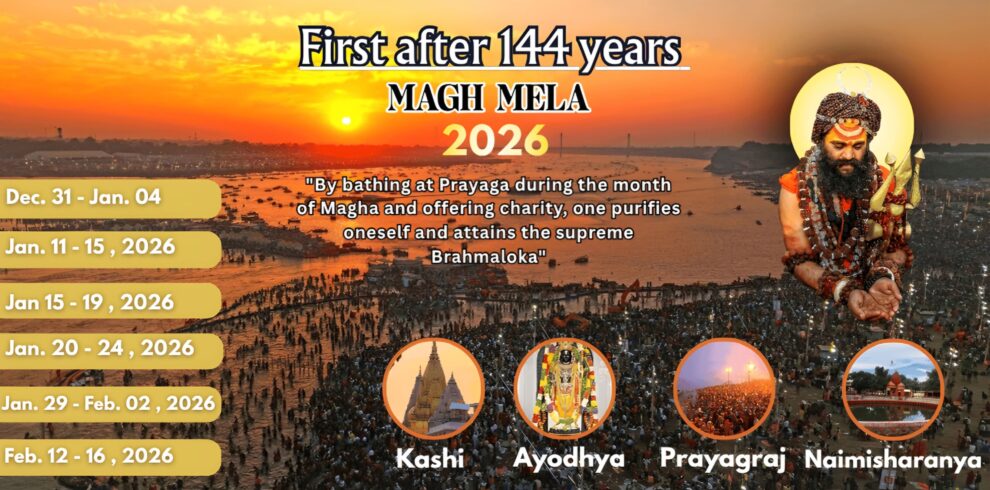 A Rare Conjunction After 144 Years Maha Kumbh Mela ! Join Us for Magh Mela 2026. Take a holy dip at the Triveni Sangam at Prayagraj and be blessed for a lifetime!